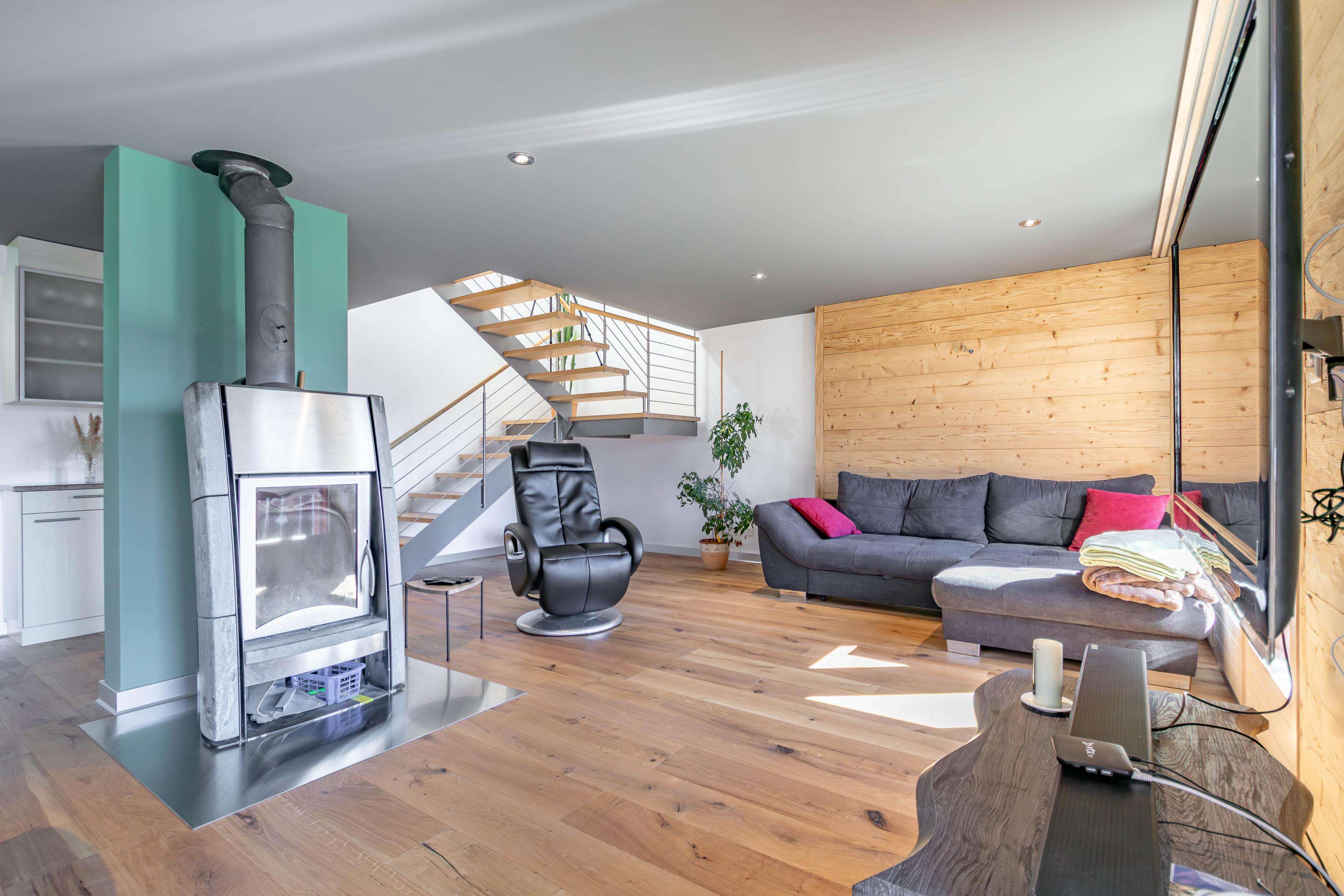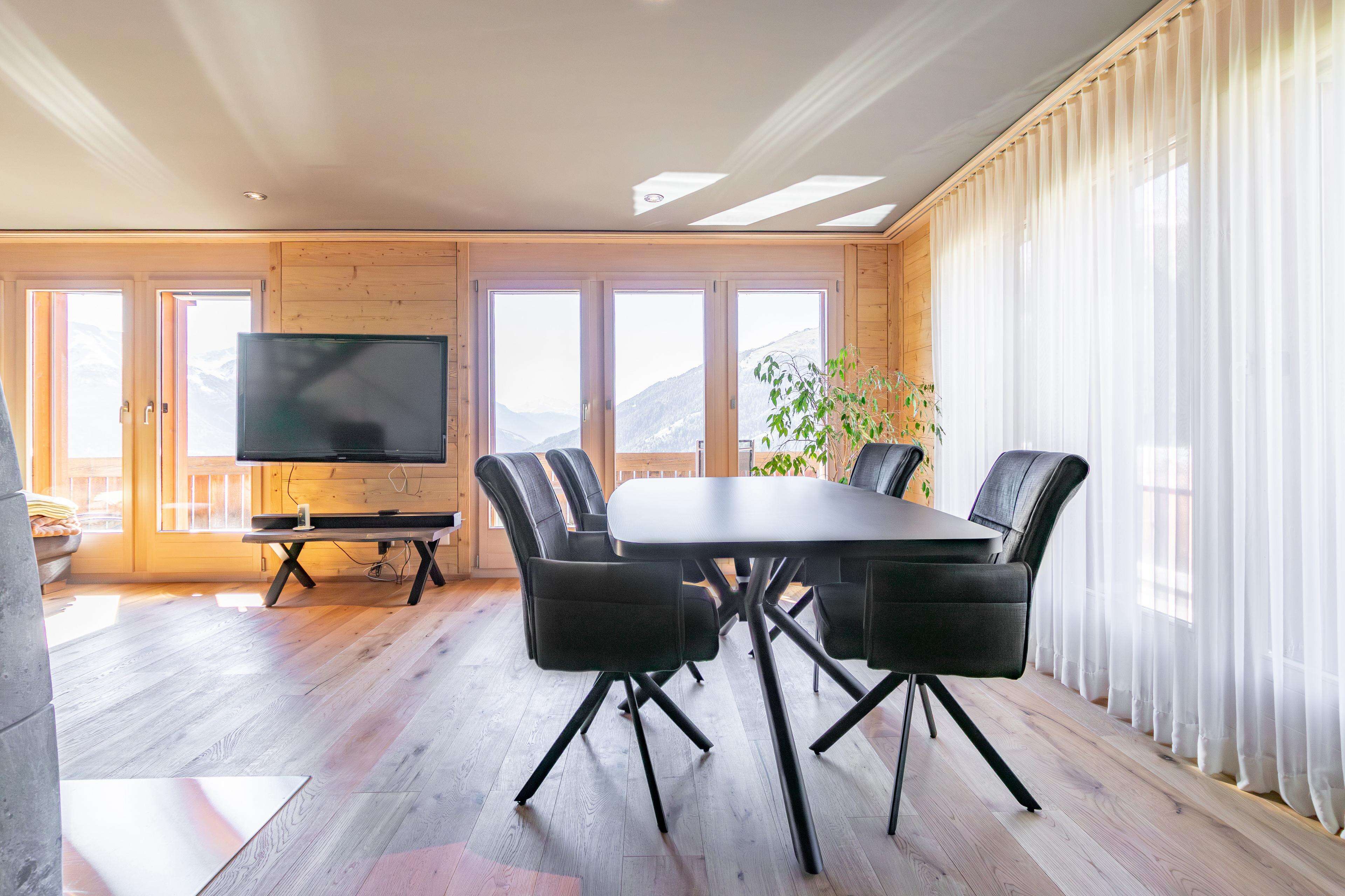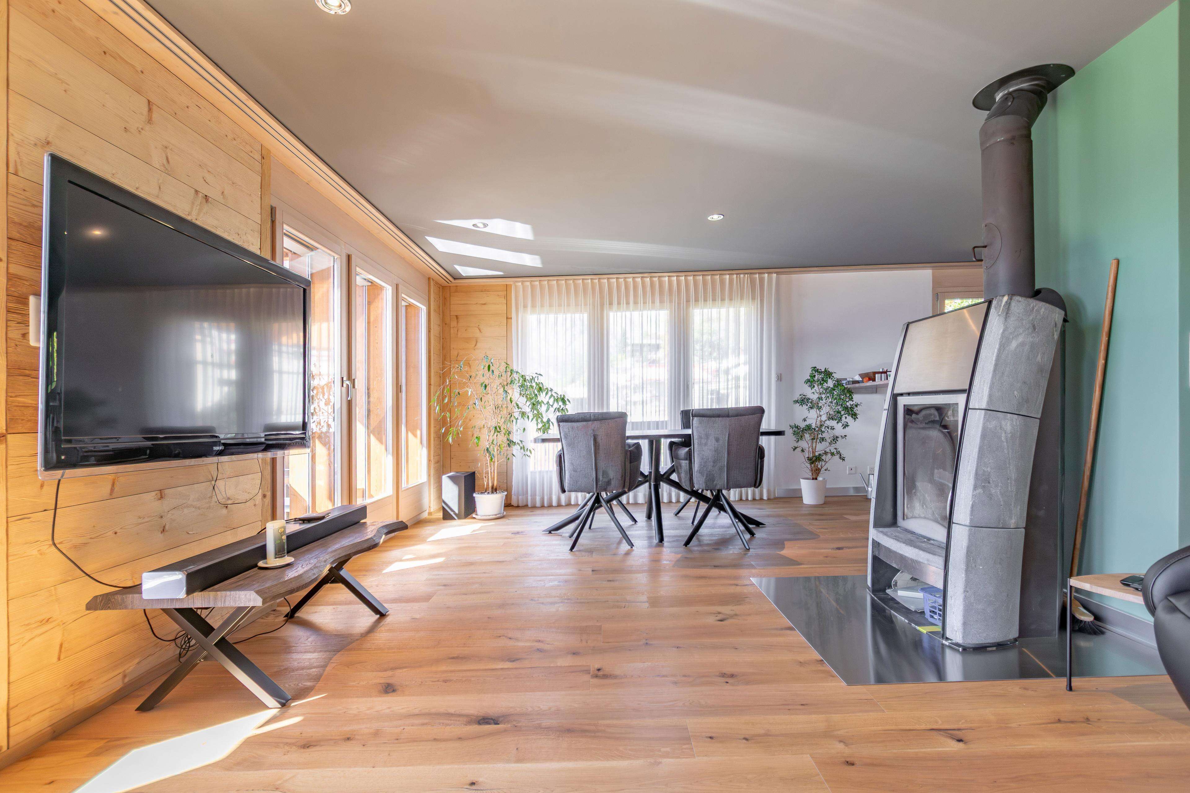 Die Duplexwohnung erstreckt sich über die beiden obersten Etagen, befindet sich in einem nahezu neuwertigen Zustand und wurde 2025 umfassend modernisiert. Hochwertige Bodenbeläge, eine moderne Fussbodenheizung, neue Oberflächen sowie ein stilvoller Specksteinofen verleihen dem Wohnbereich ein alpines, warmes Ambiente. Die Küche ist mit V-Zug-Geräten ausgestattet und erfüllt höchste Ansprüche. Zwei Balkone eröffnen atemberaubende Ausblicke auf das Tal und die Bergwelt.