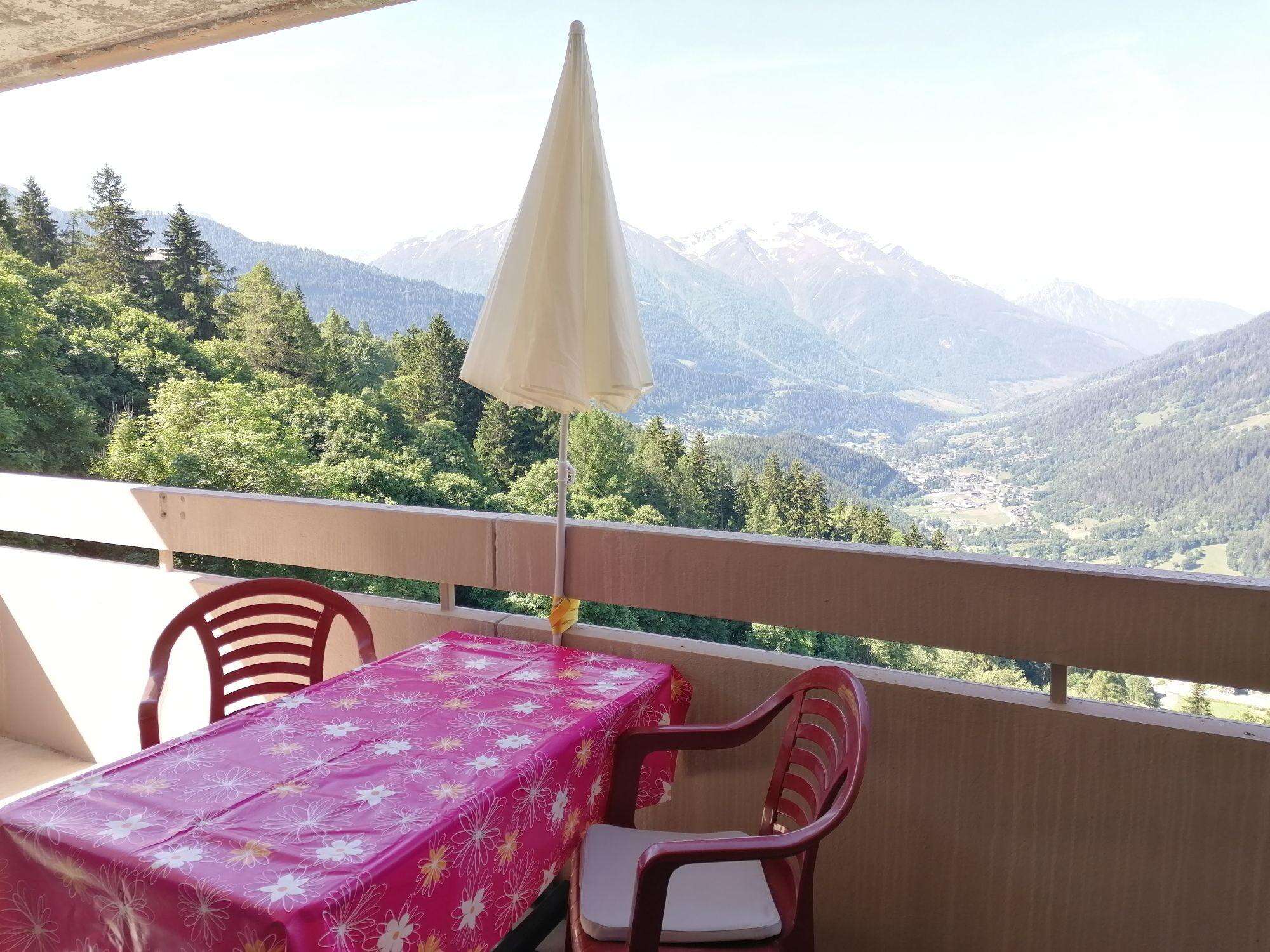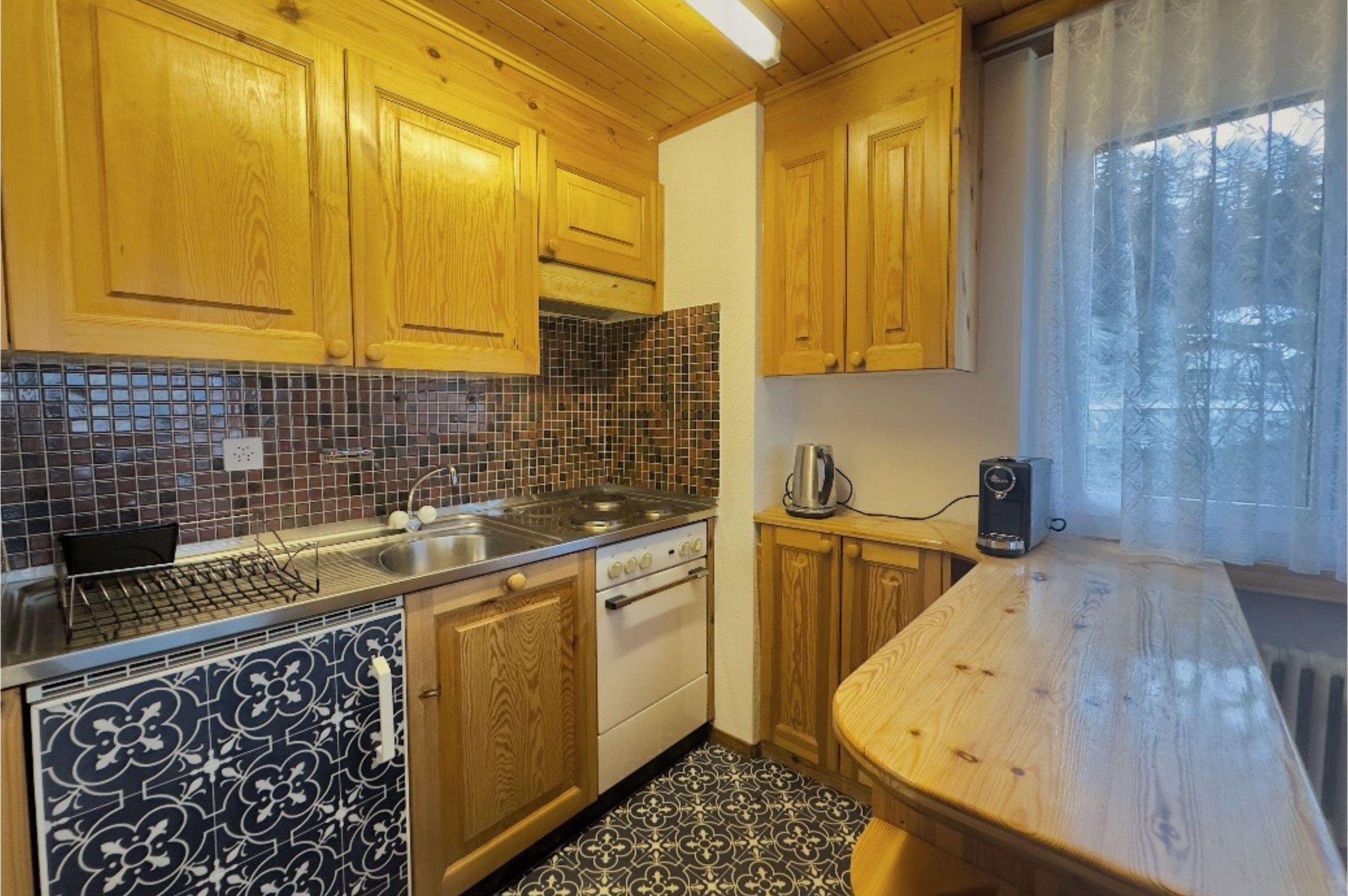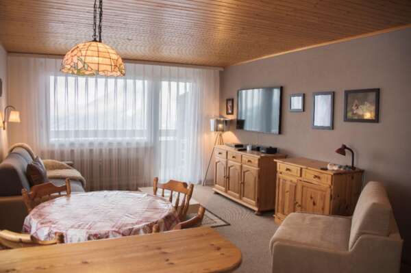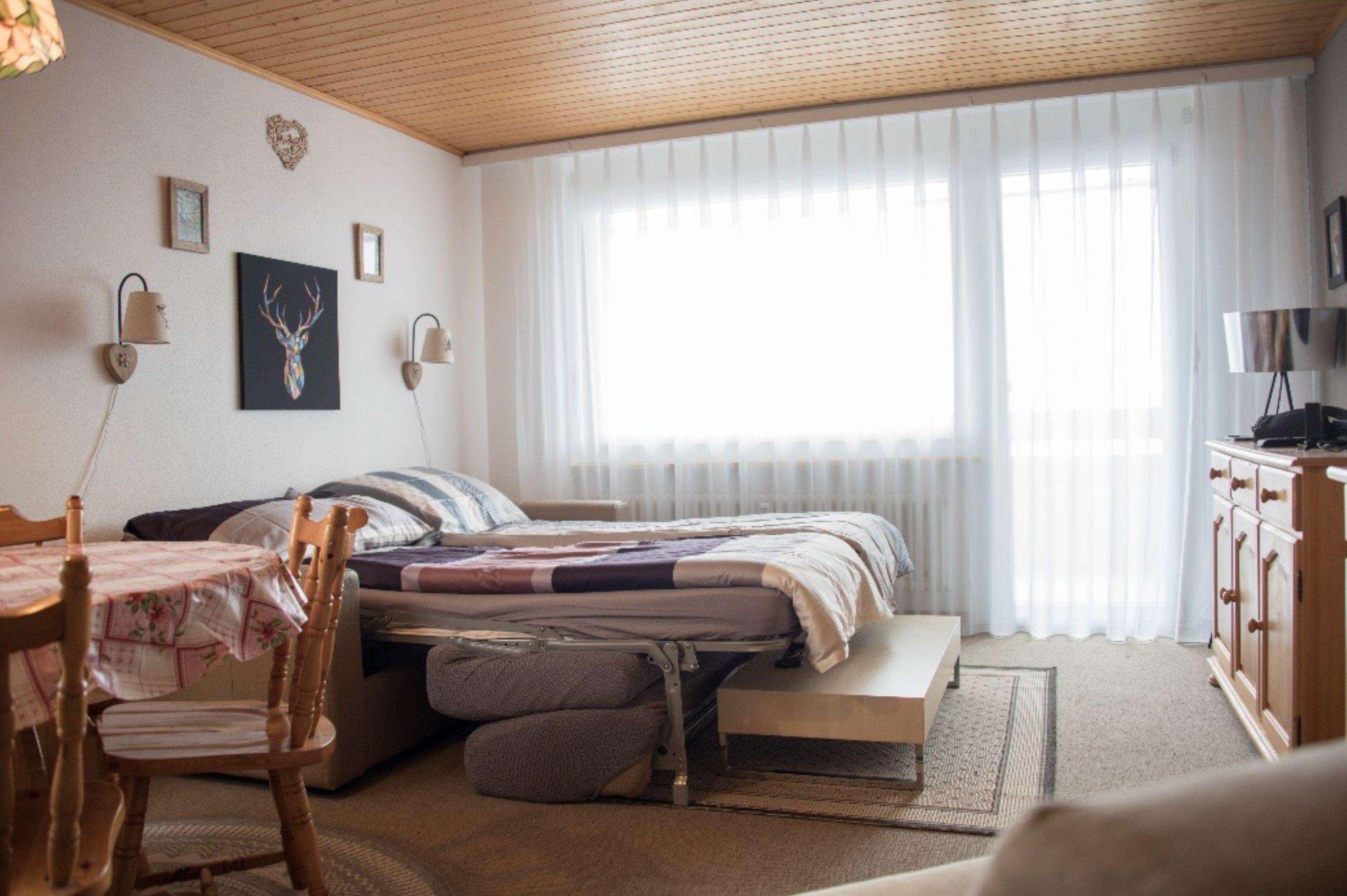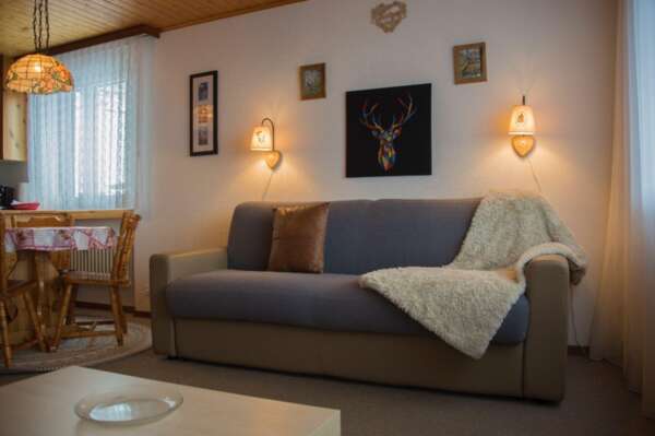 Das schöne und modern eingerichtete Studio verfügt über ein helles Wohnzimmer mit ausklappbarem Bettsofa für zwei Personen und einem ausklappbaren Sessel für eine Person und einen Smart TV. Zum Studio gehört einen grossen Balkon mit atemberaubendem und weitem Blick auf den Weisshorn sowie auf die umliegenden Walliser Alpen. In der Wohnung befindet sich, eine offene Küche, einen Essplatz mit vier Stühlen sowie ein Badezimmer mit Dusche.