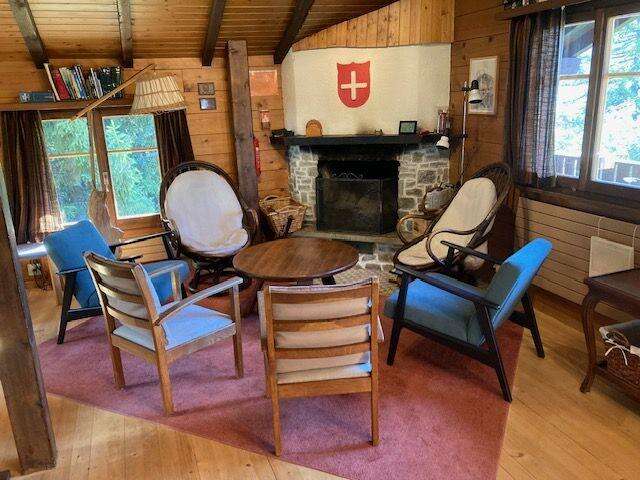 Einrichtung Erdgeschoss: kleine Küche mit Esstisch, Wohnraum mit Sitzmöglichkeiten und Cheminée, Tages-WC, Garderobe