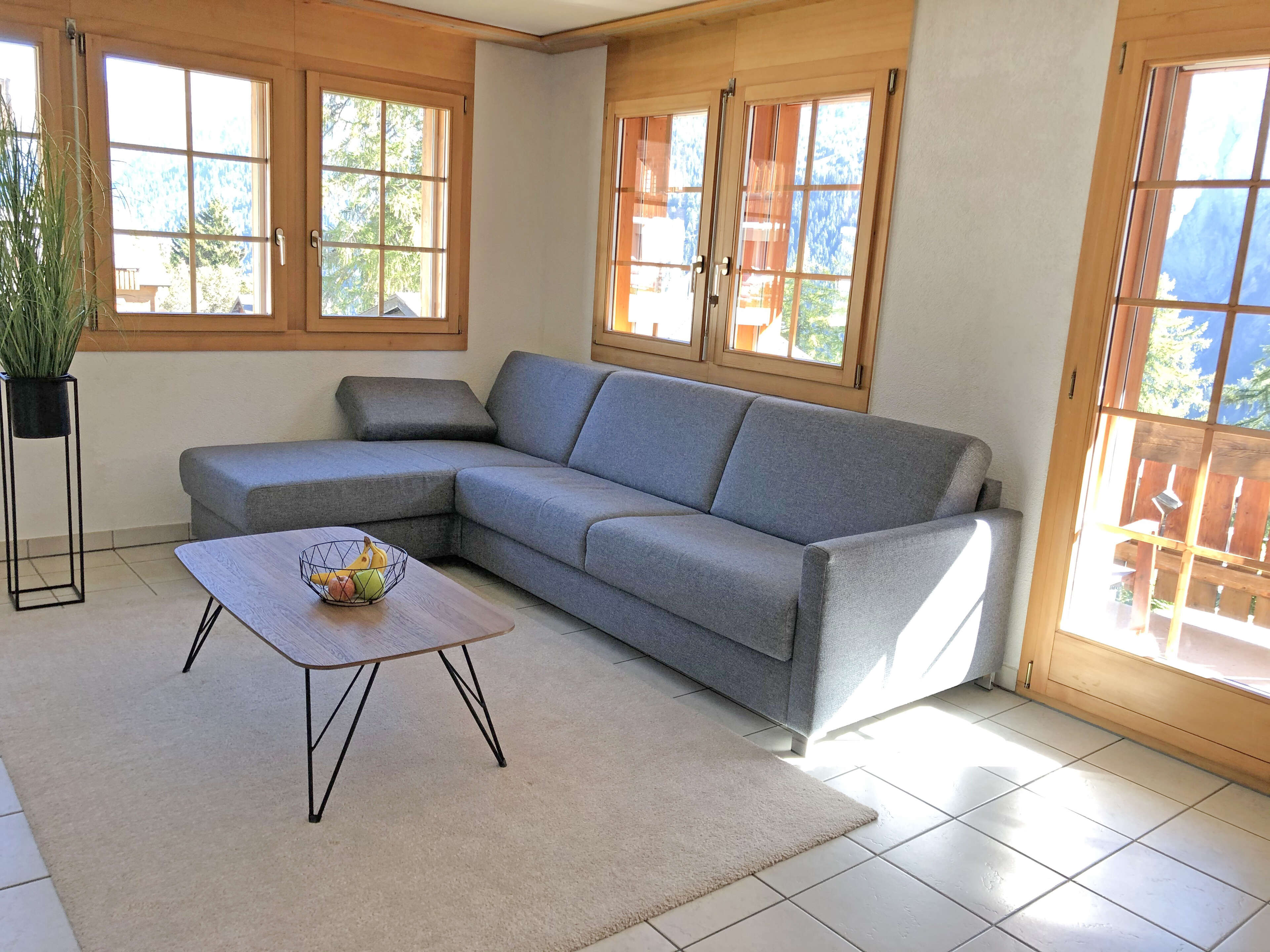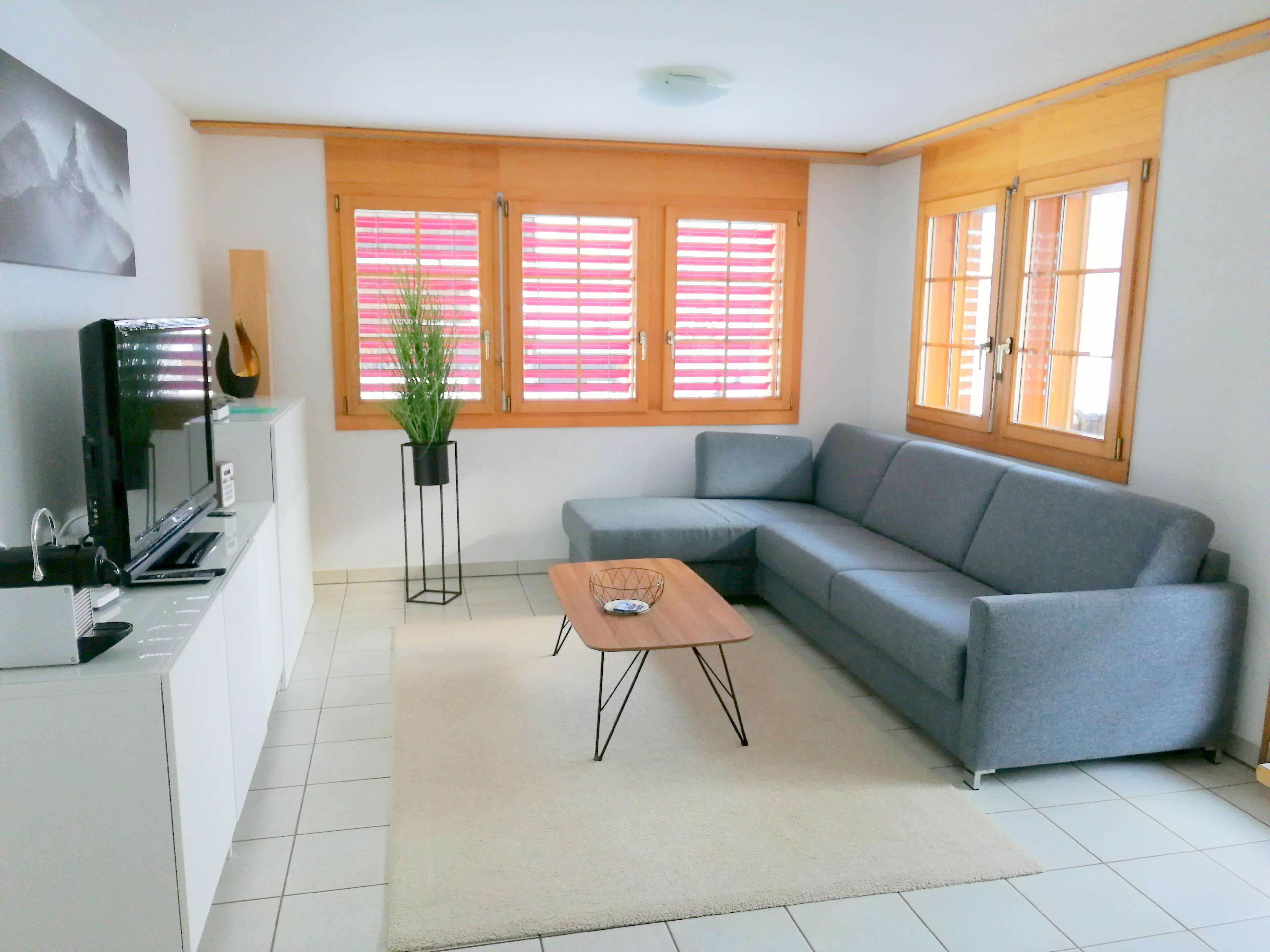 Einrichtung: Garderobe, helles Wohnzimmer mit TV und einem grossen Schlafsofa, offene Küche mit Esstisch, 2 Schlafzimmer (1 Doppelbett und 1 Stockbett mit 1 Einzelbett), Badezimmer mit Dusche
